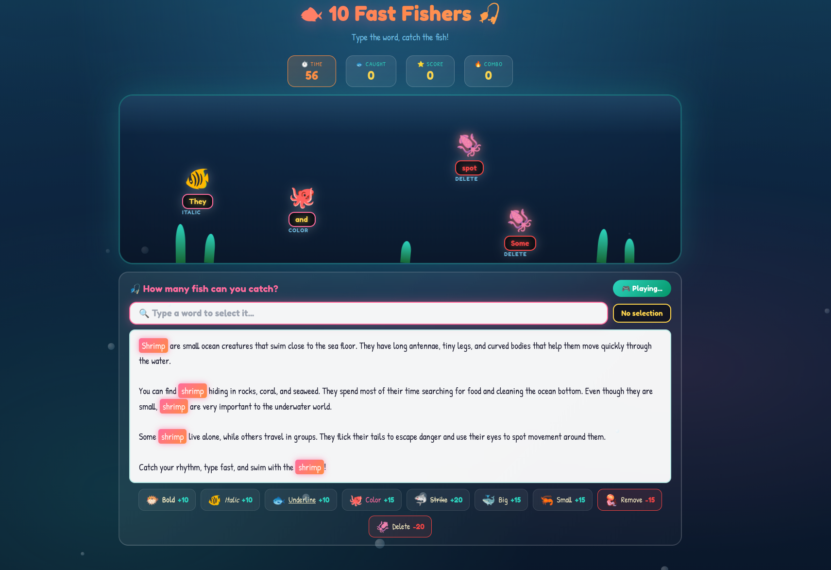 Watch colorful fish swim across your screen, each carrying a word. Type fast, match the word, click the fish, and watch your document transform before your eyes. Bold pufferfish, italic angelfish, and even some sneaky jellyfish that'll mess with your formatting!