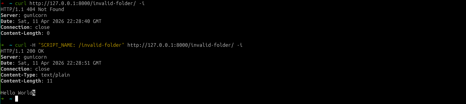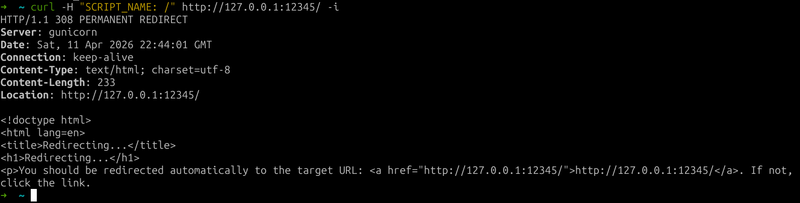 This is where the last piece of the puzzle had to be found: the SCRIPT_NAME request header! In gunicorn 21.2.0 (and still in the latest version), this request header can be used to specify the "request root prefix".