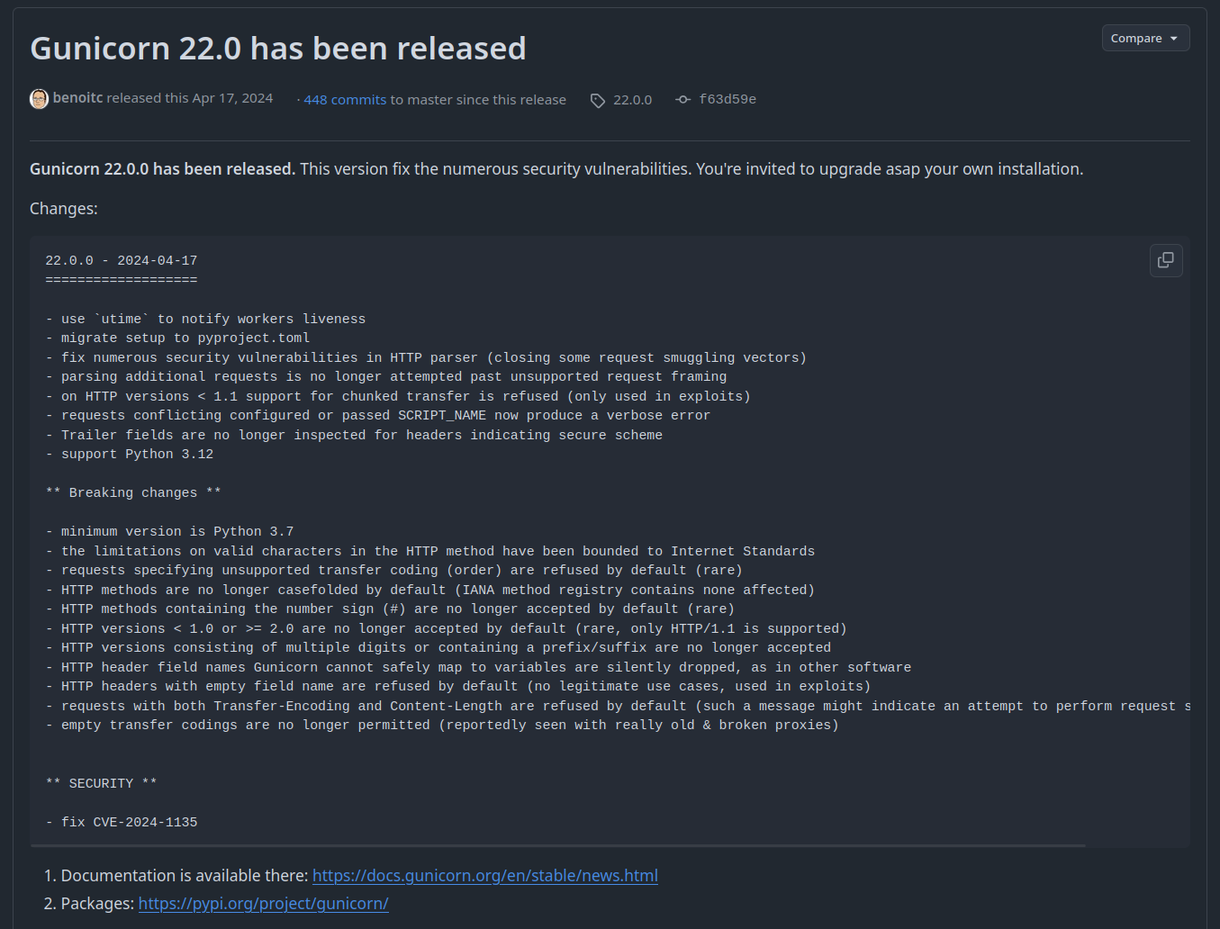 fig. 84: Gunicorn 22.0.0 release notes (source).