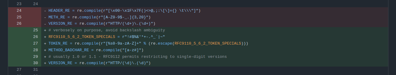 Another important point is that this regex check occurs right before upper()-ing the method name. Because of that, HEAd would be a valid HEAD request for gunicorn 21.2.0.